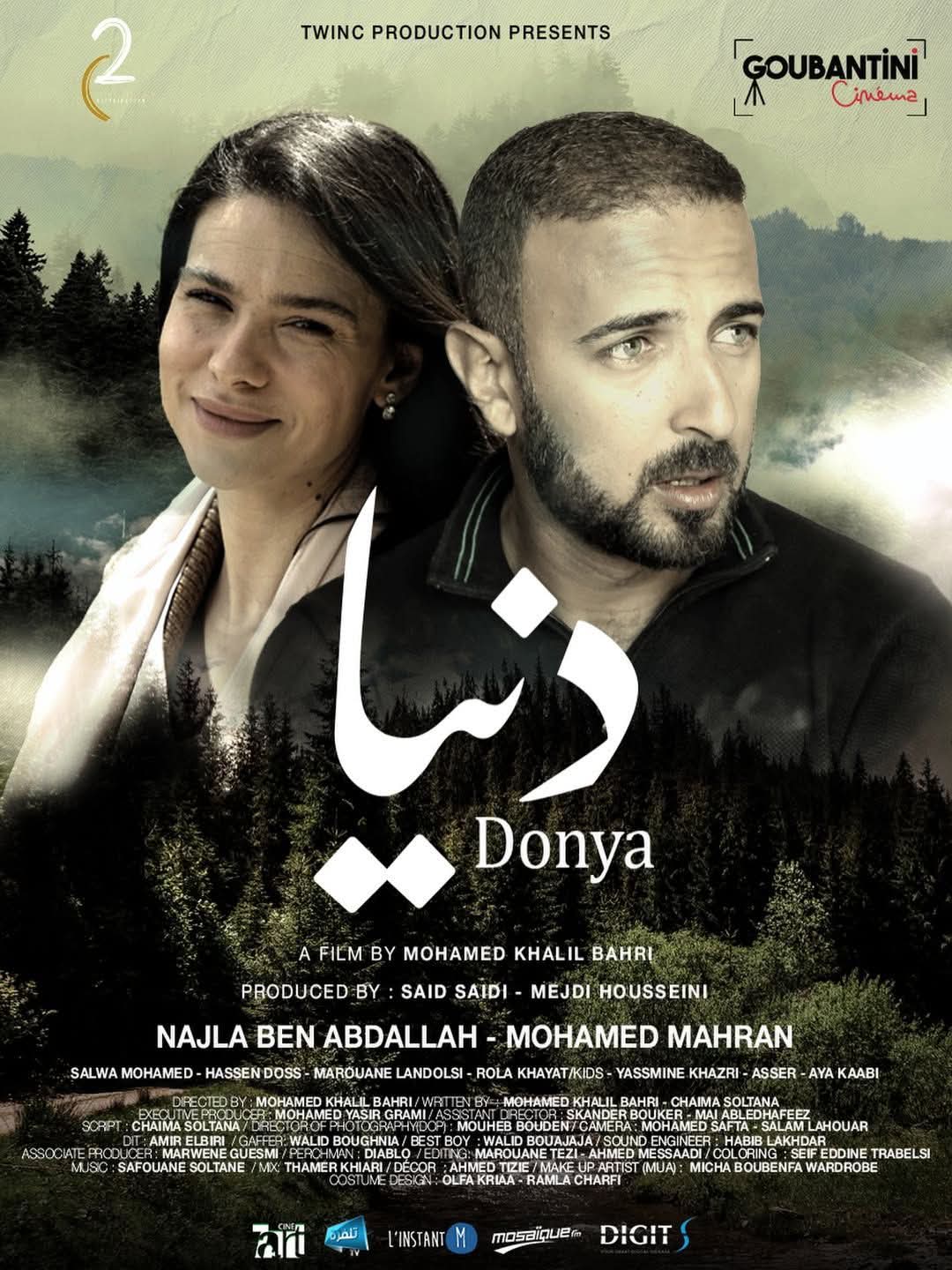 ويُعد «دنيا» عملاً سينمائيًا روائيًا طويلاً، من بطولة نجلاء بن عبد الله ومحمد مهران، إلى جانب مشاركة عدد من الأسماء التونسية، من بينهم سلوى محمد وحسان الدوس، الذي تولّى أيضًا أداء الأغنية الرسمية للفيلم.