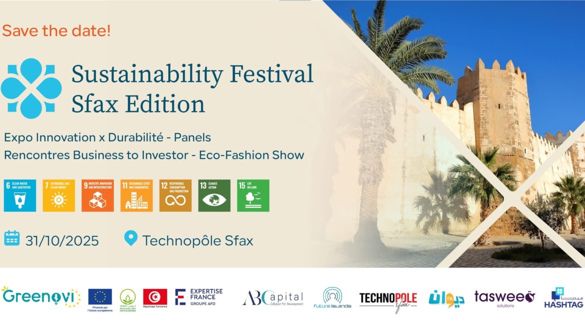 في إطار اليوم العالمي للمدن المستدامة، تستعد مدينة صفاقس لاحتضان حدث غير مسبوق في تونس “Sustainability Festival Sfax Edition”، الذي تنظّمه Alternative Business Capital ABCapital يوم 31 أكتوبر 2025، بالشراكة مع Technopole Sfax وFuture Islands. الحدث لا يقتصر على التوعية البيئية فحسب، بل يسعى إلى خلق حراك وطني حول الاستدامة والابتكار الأخضر، عبر برنامج يجمع بين المعارِض، واللقاءات الاستثمارية، والنقاشات التفاعلية، والعروض…
