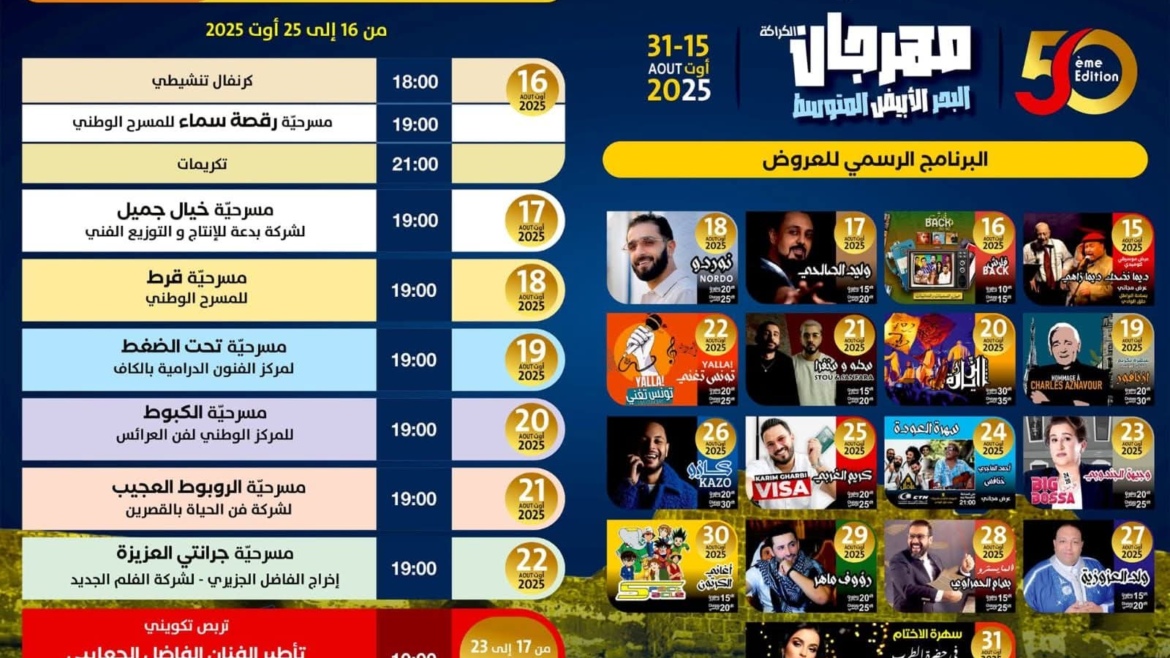تنطلق العروض يوميًا بداية من الساعة العاشرة ليلاً، على ركح الملعب البلدي بالكرم في حلق الوادي حيث تمتزج الذاكرة بالتاريخ، والمسرح بالهوية، يعود مهرجان “الكرّاكـة – البحر الأبيض المتوسّط” ليضيء ركح المدينة في دورته الخمسين، من 15 إلى 31 أوت 2025، محتفيًا بنصف قرن من الإبداع الفني المتجذر في الضفة الجنوبية للمتوسّط. ينظّم هذا الحدث الثقافي العريق بإشراف مباشر من جمعية مهرجان…